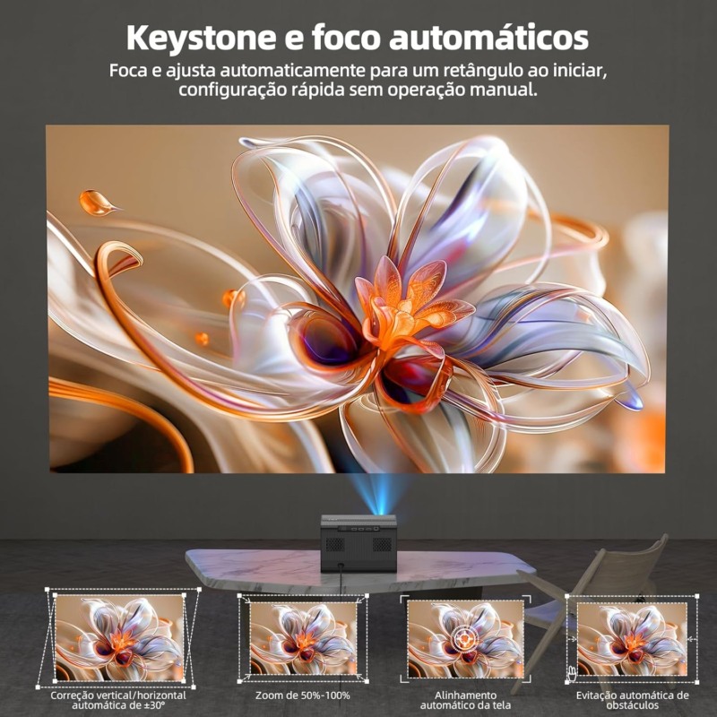 • 【Electric-Focus and Auto Correção Trapezoidal】Say goodbye to manual focusing and keystone correction with our smart remote control function, which allows for precise adjustments with just one step. Plus, the digital focus ensures a clear and crisp image no matter the angle or position of the smart projetor de imagem.