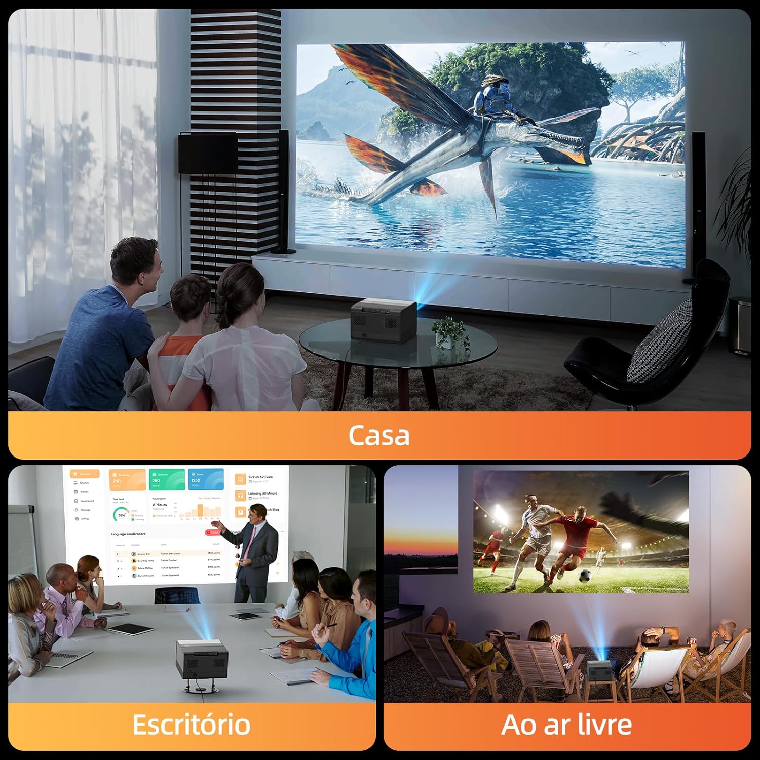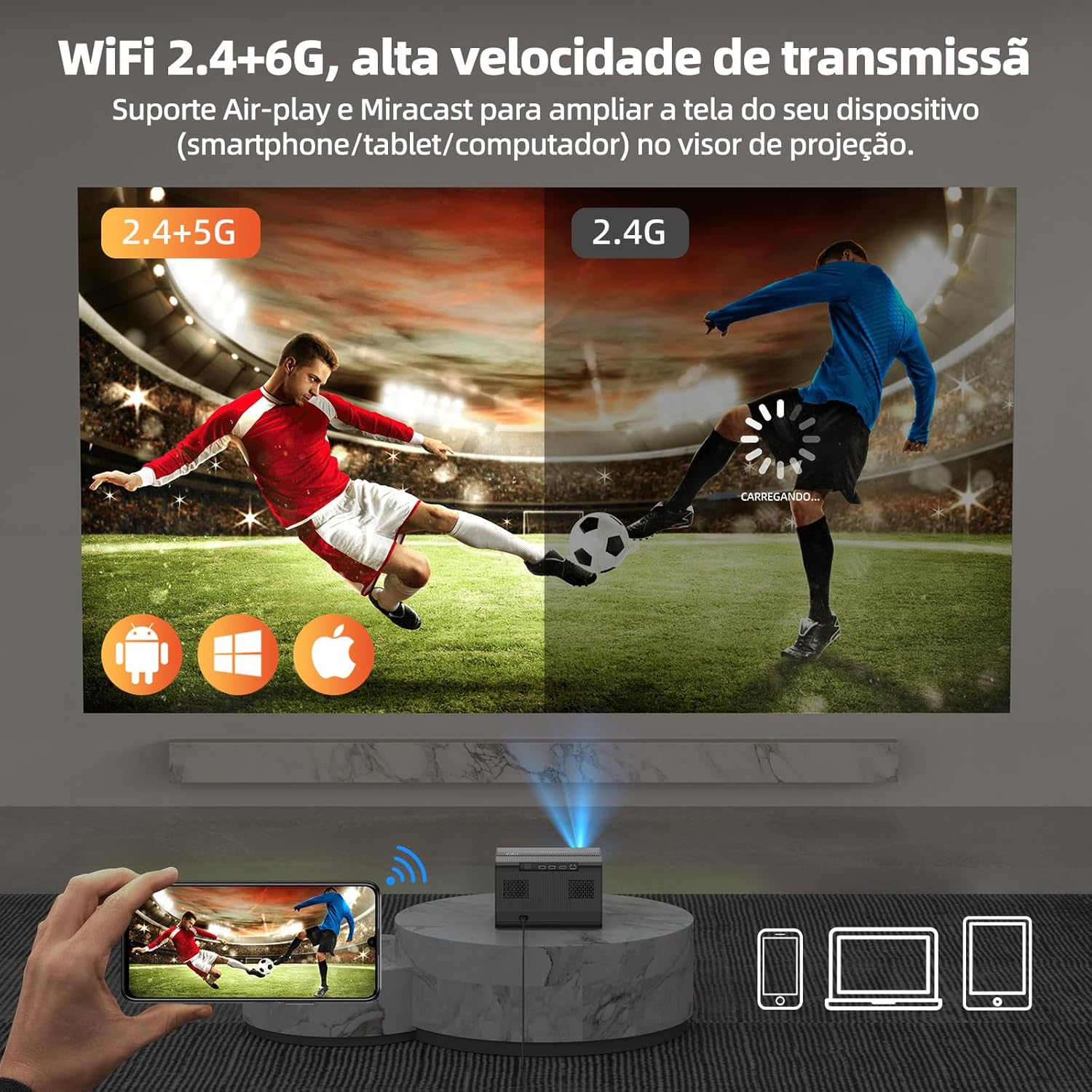 • 【Tecnologia WiFi 5G + 2.4G usada e alto-falantes HiFi integrados de 16 W】 Utilizamos a mais recente tecnologia WiFi 5G+2.4G neste progetor Bluetooth, com uma velocidade de transmissão pelo menos 30% mais rápida do que outros projetor portátil. Com este projetor smart sem fio, você pode aproveitar ao máximo a diversão proporcionada pela transmissão em velocidade ultra-alta. Os alto-falantes HiFi integrados de 16 W oferecem agudos e graves nítidos para proporcionar uma verdadeira experiência de teatro.