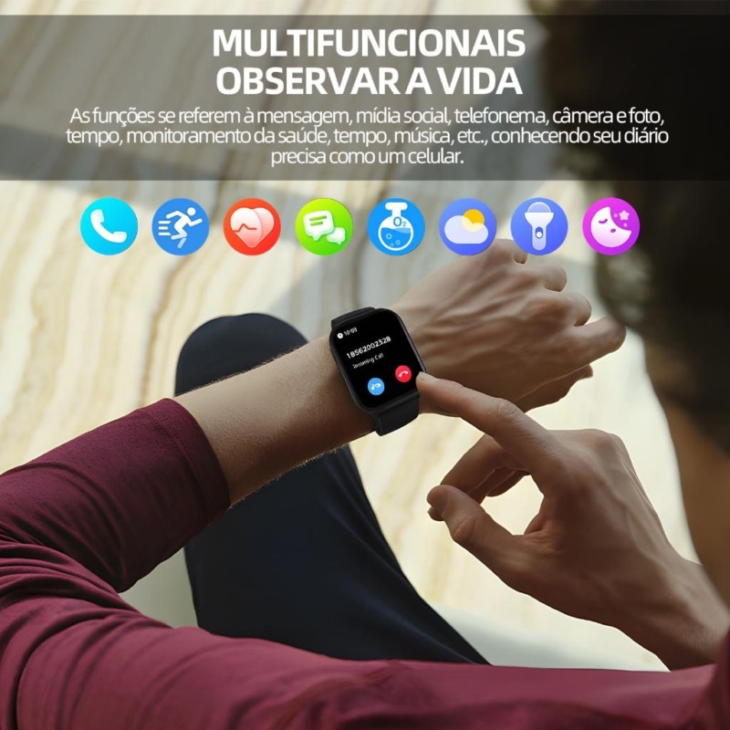 Funcionalidades de Mensagens e Redes Sociais: O relógio possibilita a leitura de mensagens de plataformas como WhatsApp, Facebook, Twitter, entre outras. No entanto, não oferece a capacidade de responder a essas mensagens. Além disso, ele exibe notificações de redes sociais diretamente na tela do dispositivo